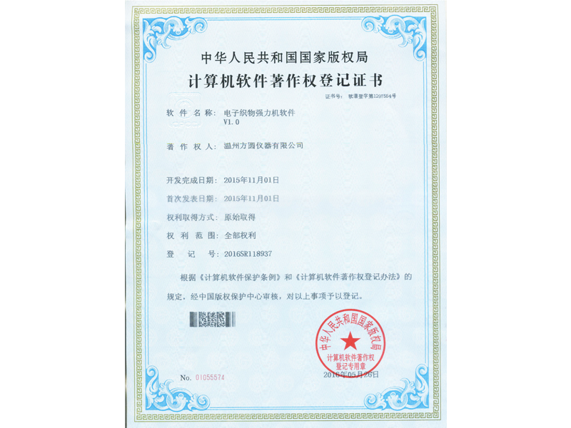 中華人民共和國國家版權(quán)局 計算機(jī)軟件著作權(quán)登記證書:電子織物強(qiáng)力機(jī)軟件V1.0(軟著登字第1297554號)