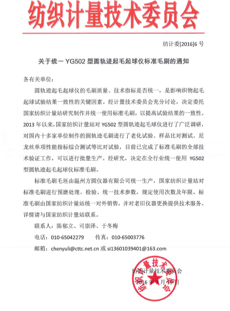 關(guān)于統(tǒng)一YG502型圓軌跡起毛起球儀標(biāo)準(zhǔn)毛刷的通知各有關(guān)單位:圓軌跡起毛起球儀的毛刷質(zhì)量、技術(shù)指標(biāo)是否統(tǒng)一,是影響織物起毛起球試驗(yàn)結(jié)果一致性的關(guān)鍵因素。經(jīng)計(jì)量技術(shù)委員會(huì)充分討論,決定委托紡織計(jì)量站研究制作并統(tǒng)一使用標(biāo)準(zhǔn)毛刷,以提高試驗(yàn)結(jié)果的一致性。2013年以來(lái),紡織計(jì)量站對(duì)YG502型圓軌跡起毛起球儀進(jìn)行了廣泛調(diào)研,對(duì)國(guó)內(nèi)十多家單位制作的圓軌跡毛刷進(jìn)行了老化試驗(yàn)、樣品比對(duì)測(cè)試、尼龍絲單項(xiàng)性能指標(biāo)綜合測(cè)試等比對(duì)試驗(yàn),目前已完成了標(biāo)準(zhǔn)毛刷的全部技術(shù)驗(yàn)證工作,可以進(jìn)行批量生產(chǎn)。經(jīng)研究,決定在全行業(yè)統(tǒng)一使用YG502型圓軌跡起毛起球儀標(biāo)準(zhǔn)毛刷。 標(biāo)準(zhǔn)毛刷毛坯由溫州方圓儀器有限公司統(tǒng)一生產(chǎn),紡織計(jì)量站對(duì)標(biāo)準(zhǔn)毛刷進(jìn)行預(yù)磨處理、檢驗(yàn)、統(tǒng)一技術(shù)參數(shù),規(guī)定使用次數(shù)及年限。標(biāo)準(zhǔn)毛刷由紡織計(jì)量站統(tǒng)一對(duì)外銷(xiāo)售,并對(duì)老舊儀器提供技術(shù)服務(wù)。